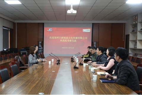 10月21日上午,郑州日新阅益文化传播有限公司品牌总经理张倩、品牌运营栗雯祺一行到访新闻与传播学院,双方围绕人才联合培养、实践基地共建等展开深度交流洽谈。洽谈会在博文楼5203会议室举行,学院党委书记杨子江、党委副书记张小鸥、教学办主任张美洁、播音与主持艺术系主任刘阳,以及学院全体辅导员、播音系学生代表共同参会。