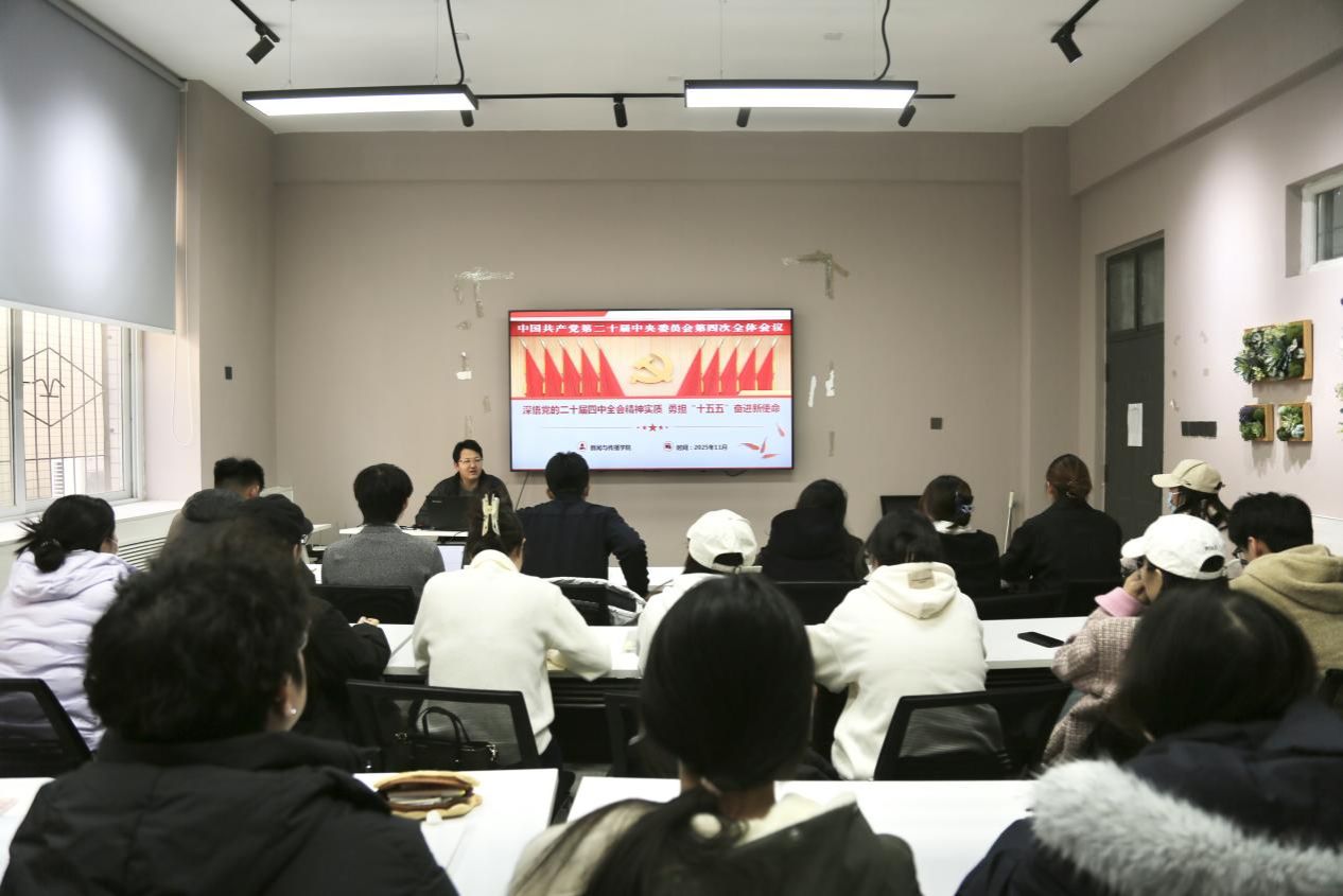 为深入学习贯彻党的二十届四中全会精神,准确把握“十五五”时期的发展方向,统一思想、凝聚力量,新闻与传播学院于11月25日在5314会议室召开党的二十届四中全会精神专题宣讲会。学院党委书记杨子江主讲,各专业师生党员代表参加会议。