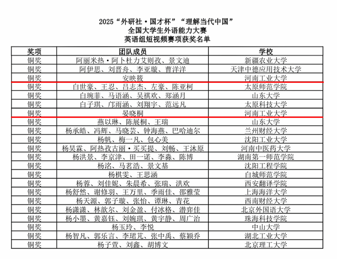 2025“外研社·国才杯”“理解当代中国”全国大学生外语能力大赛,覆盖英语、俄语、德语等11个语种,历经校赛、省赛、国赛三个赛段,共收到来自1100余所院校的17778部作品,最终400余名选手在激烈角逐中脱颖而出,晋级全国总决赛。经过激烈角逐,最终,24播音安映筱、24播音晏晓桐斩获河南省特等奖和国家铜奖。