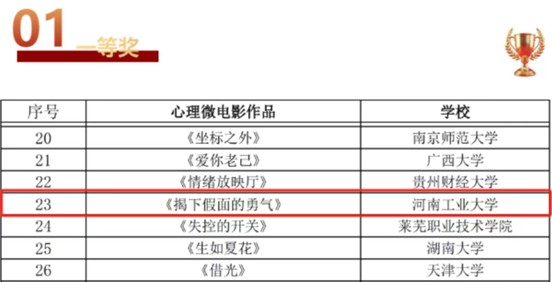 近日,首届心理微电影节暨第五届全国高校心理微电影优秀作品展示活动的评选结果正式揭晓。由新闻与传播学院王芳老师指导、2023级广播电视学专业刘若涵担任团队主创的作品《揭下假面的勇气》斩获一等奖。本次比赛共评选出一等奖30项,我院作品凭借深刻的主题立意、细腻的镜头表达和真挚的情感传递,获得评审专家高度认可。