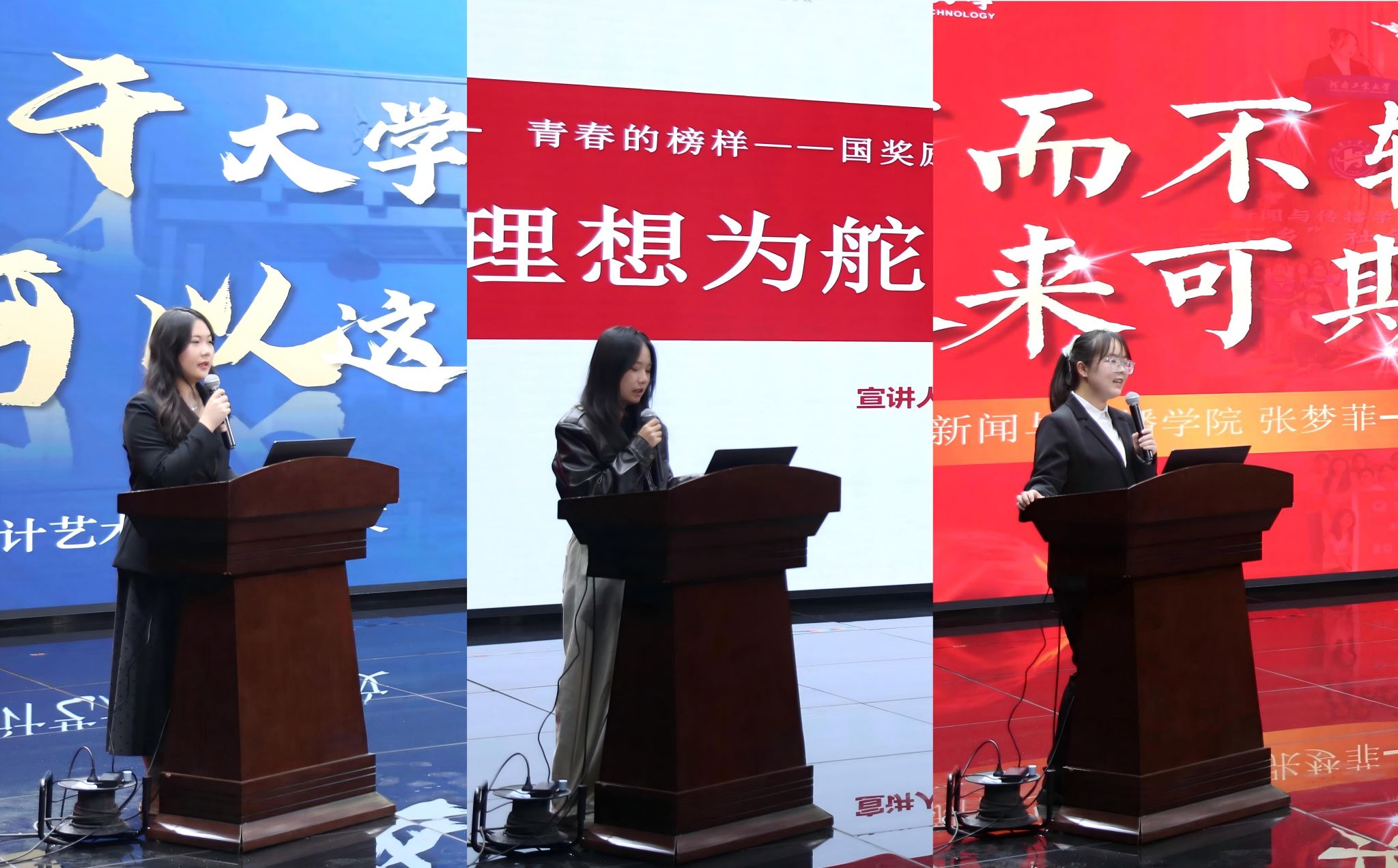 宣讲环节,三位国奖获得者分享成长历程与实践感悟。设计艺术学院孙瀚文立足专业,将学科竞赛与专业学习深度融合,以“以赛促学、以赛促研”的实践经历,诠释新时代设计学子以创新赋能文化传承的青春担当。新闻与传播学院张梦菲出身乡村,在国家资助支持下坚定求学之路,赴甘肃酒泉宣讲“两弹一星”精神,深入乡村普及资助政策、关爱留守儿童,以推免至兰州大学的实际行动,践行扎根西部、服务基层的青春誓言。新闻与传播学院彭嘉琪平衡学生工作、学术科研与社会实践,以“统筹兼顾、精准发力”的态度,展现新时代青年在多元角色中追求卓越的综合素养。三位同学的宣讲真挚鲜活、感人至深,赢得现场阵阵掌声。