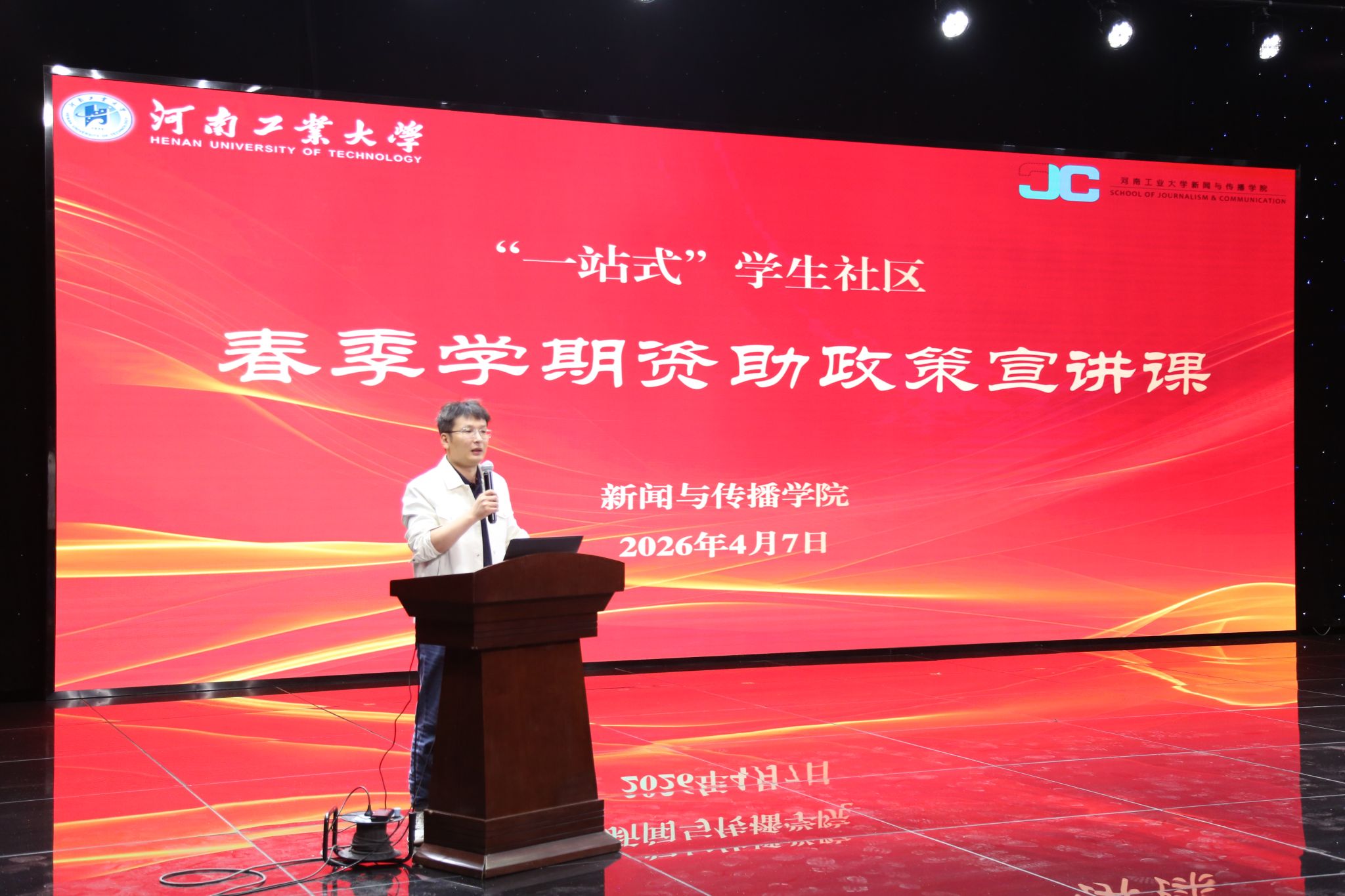 为切实落实学校学生资助工作部署要求,推动国家及学校资助政策精准落地、惠及每一位家庭经济困难学生,近日,新闻与传播学院在5100演播厅举办“一站式”学生社区2026年春季学期资助政策宣讲课。学院党委副书记张小鸥,学工办主任王雅凤,团委副书记孔丽,辅导员王芳、郑皓星出席活动,院学生会生活部成员及2024级全体本科生参加本次宣讲。