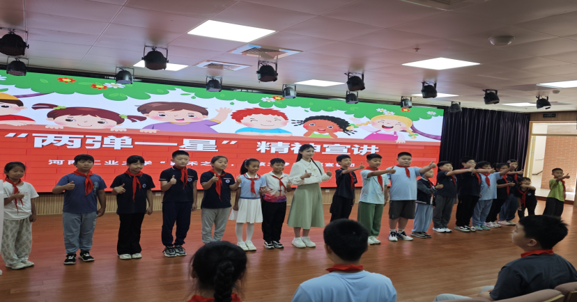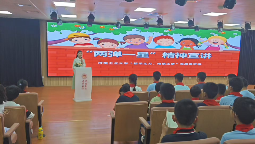为深入贯彻习近平总书记关于传承和弘扬“两弹一星”精神的重要指示,积极响应学校“两弹一星”精神志愿宣讲专项社会实践号召,河南工业大学新闻与传播学院“新禾之力,传核之梦”志愿宣讲团于2025年6月5日上午走进河南省实验小学北龙湖校区,面向该小学三四年级200余名师生开展了“两弹一星”精神志愿宣讲活动。