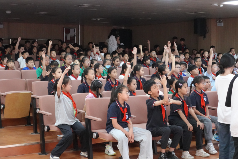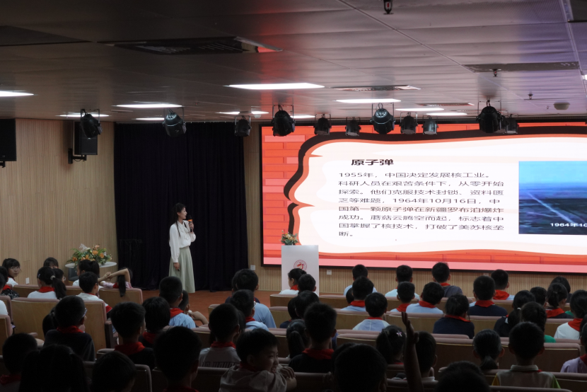 宣讲首先从历史大背景出发,回顾新中国成立初期的国防形势。主讲人程晨通过提问的方式让小学生们了解到“两弹一星”的“两弹”和“一星”分别是什么,用生动有趣的方式向小学生们从多方面介绍了“两弹一星”精神的内涵,讲述了老一辈科学家在戈壁深处隐姓埋名、自力更生的奋斗史诗,将“热爱祖国、无私奉献,自力更生、艰苦奋斗”的精神火种播撒进童心,获得了学生们的积极响应。主讲人用鲜活事例让现场师生感受到,正是无数科研人员舍小家为大家、不计个人得失、甘于清贫和奉献的精神支撑,让中国在短短几年内实现了与美、苏两国几乎“逐梦竞速”的科技突破。