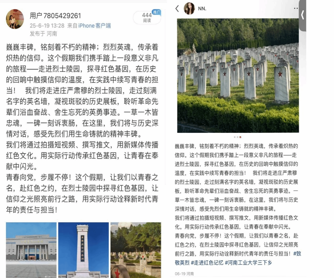 活动开始前,团队成员发挥专业特长,在线上进行多渠道宣传:团队精心制作系列文案和照片,用凝练的文字表达对烈士的敬意,同时充分利用网络资源,检索海量信息,主动发掘和了解陵园背后的红色故事与革命先辈的英勇事迹,为实践调研奠定认识基础。