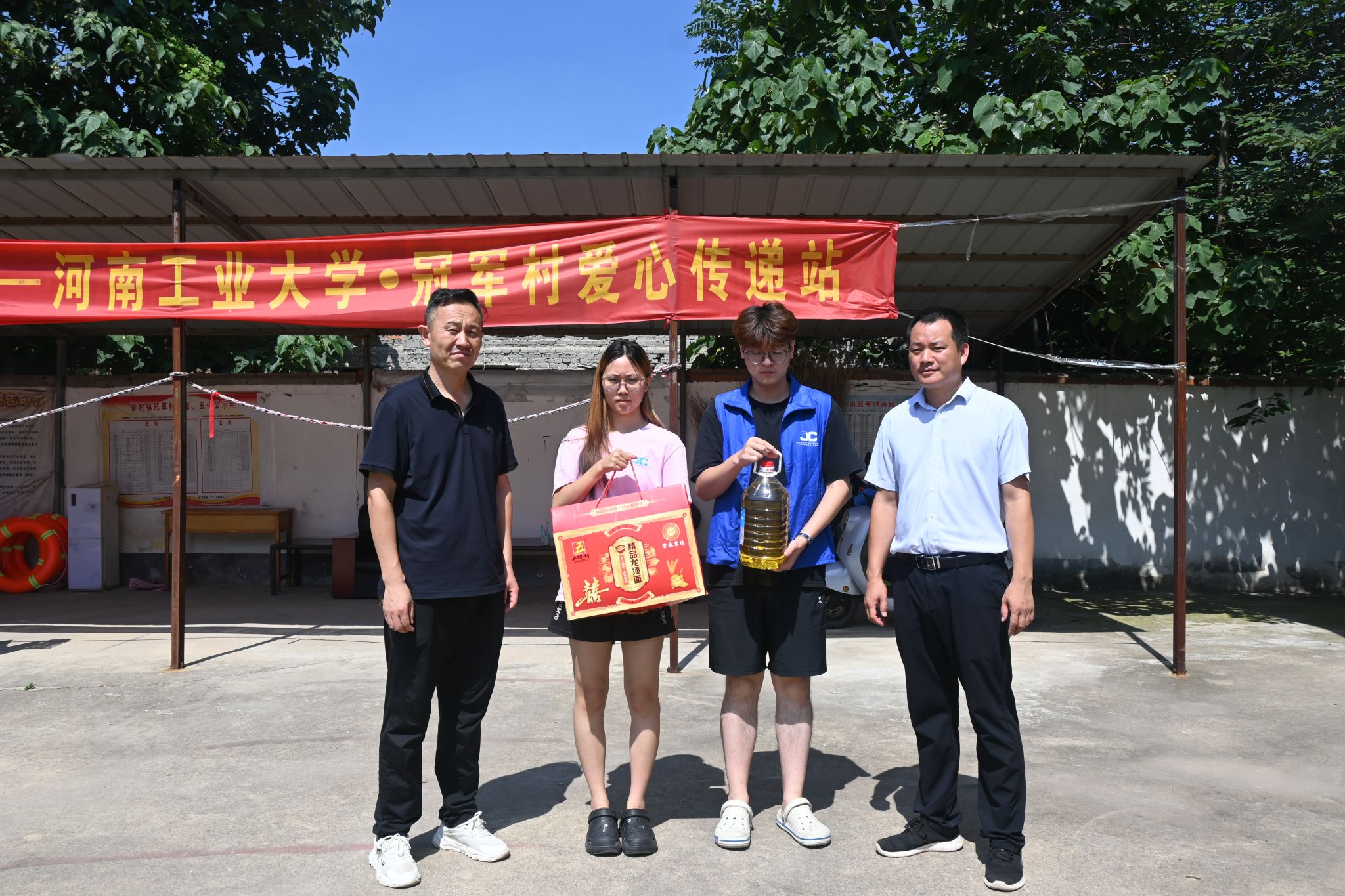 临近中午,冠军村驻村第一书记常德海与村委会成员为团队送来食用油和面条,为团队实践工作的开展提供物资支持。