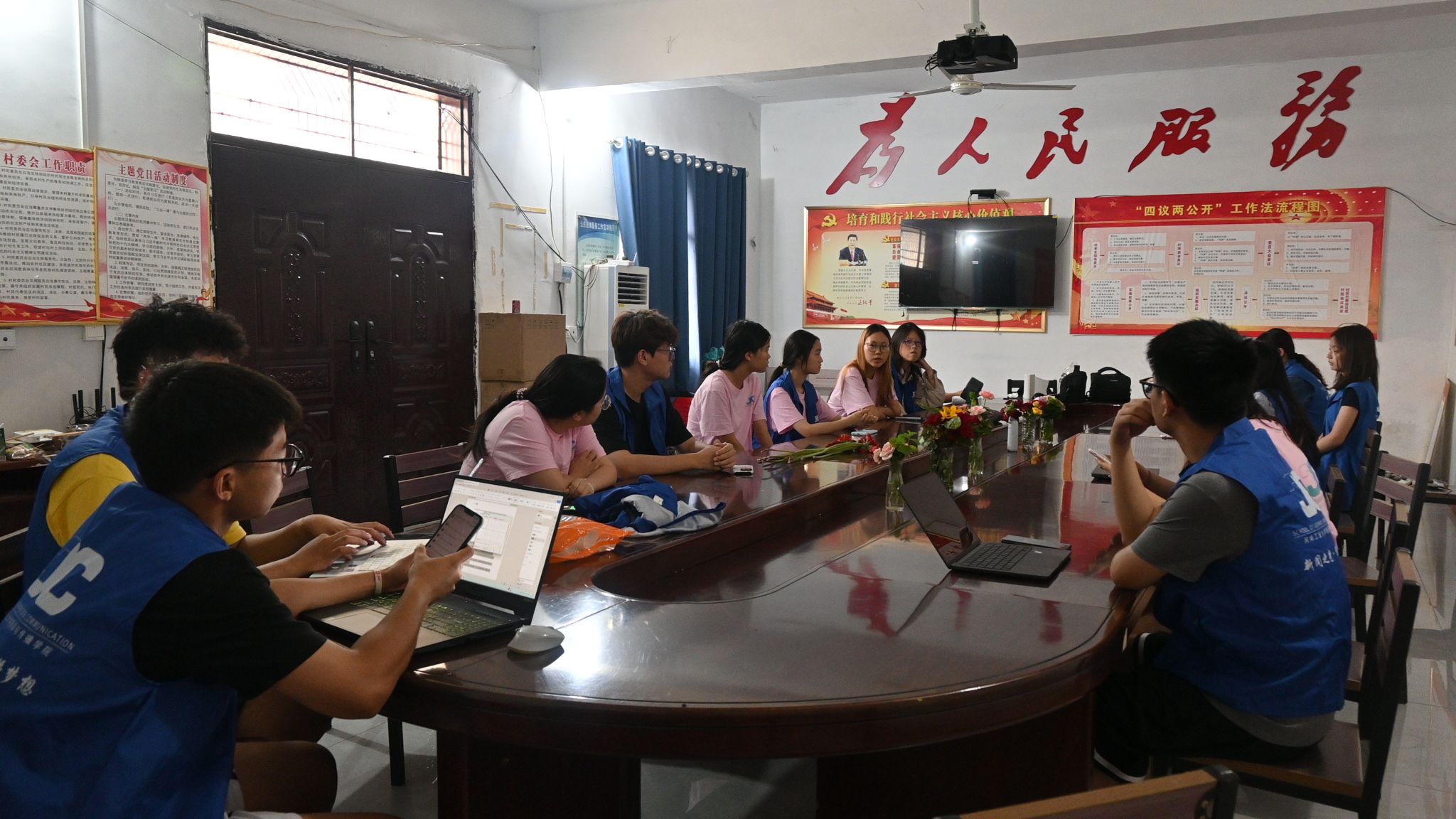 上午10点,团队于冠军村村委会会议室召开任务部署专题会议。会上详细商讨任务分配细节、后勤补助工作。会后,团队成员迅速投入工作状态,成员们分组合作,分散在村委会活动室内,通过网络平台搜寻资料,拟定框架、收集问题,在热烈的讨论中碰撞思维火花,通过分享文献等资源,构建起互通互助的协作网络。期间,冠军村村委会、村支部党员贴心送来清甜解暑的西瓜,鲜红的瓜瓤驱散了夏日的燥热,红汁浸润着暑热里忙碌的时光,甘冽的果香中、乡村的热情里,团队成员进一步将贡献乡村的热忱化作激励前行的力量。